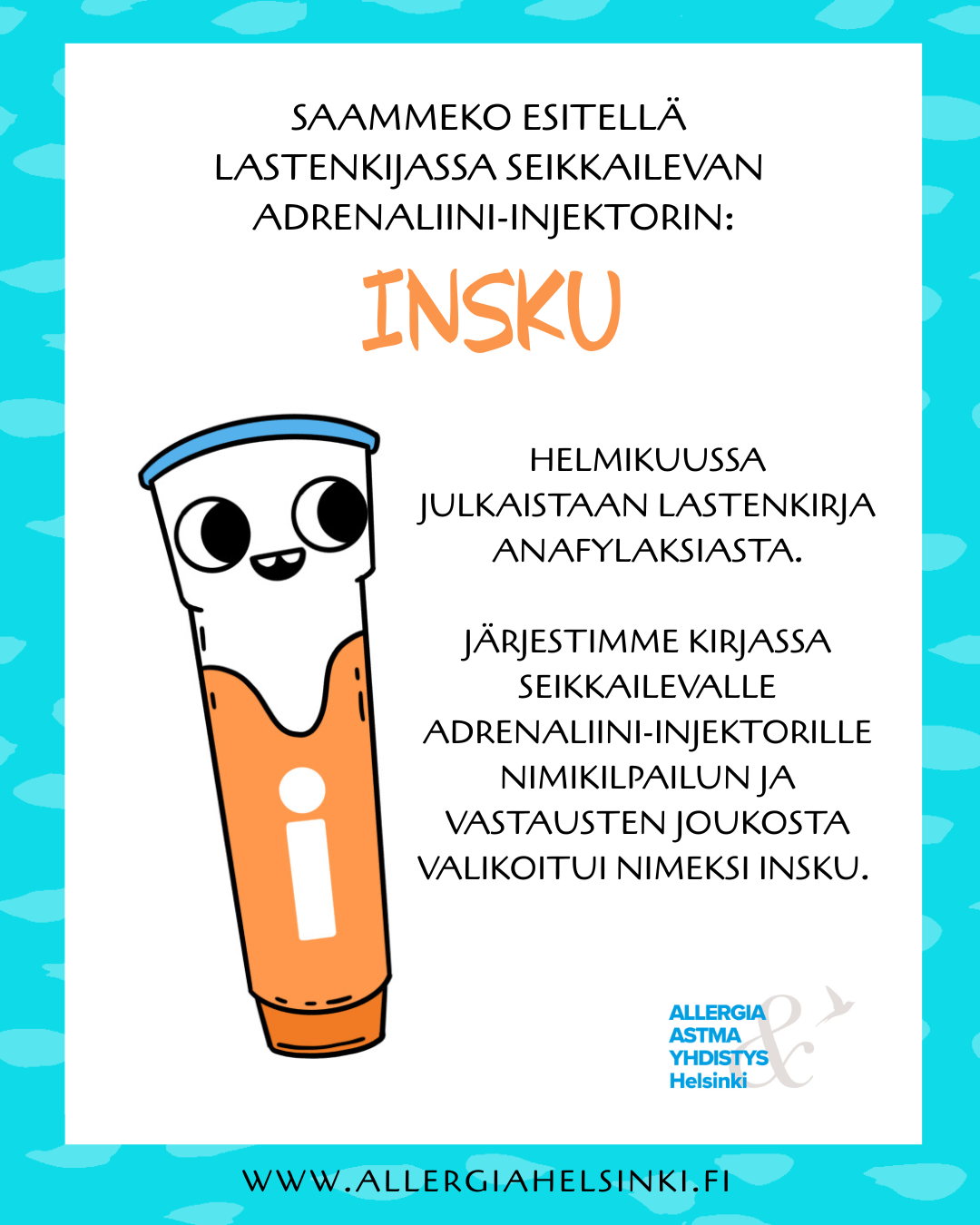 Saammeko esitellä: INSKU 😍 Helmikuussa julkaistaan lastenkirja anafylaksiasta. 📚 Järjestimme kirjassa seikkailevalle adrenaliini-injektorille nimikilpailun ja vastausten joukosta valikoitui nimeksi…