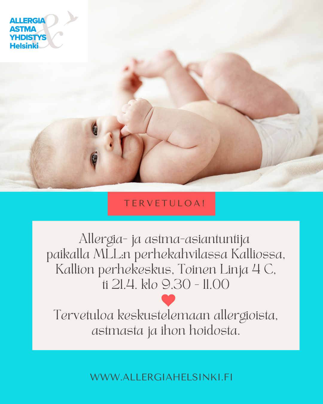 Allergia- ja astma-asiantuntija paikalla Vauvakahvilassa tiistaina 7.4. klo 13, Kamppi Roberts Coffee. Tervetuloa keskustelemaan allergioista, astmasta ja ihon hoidosta.