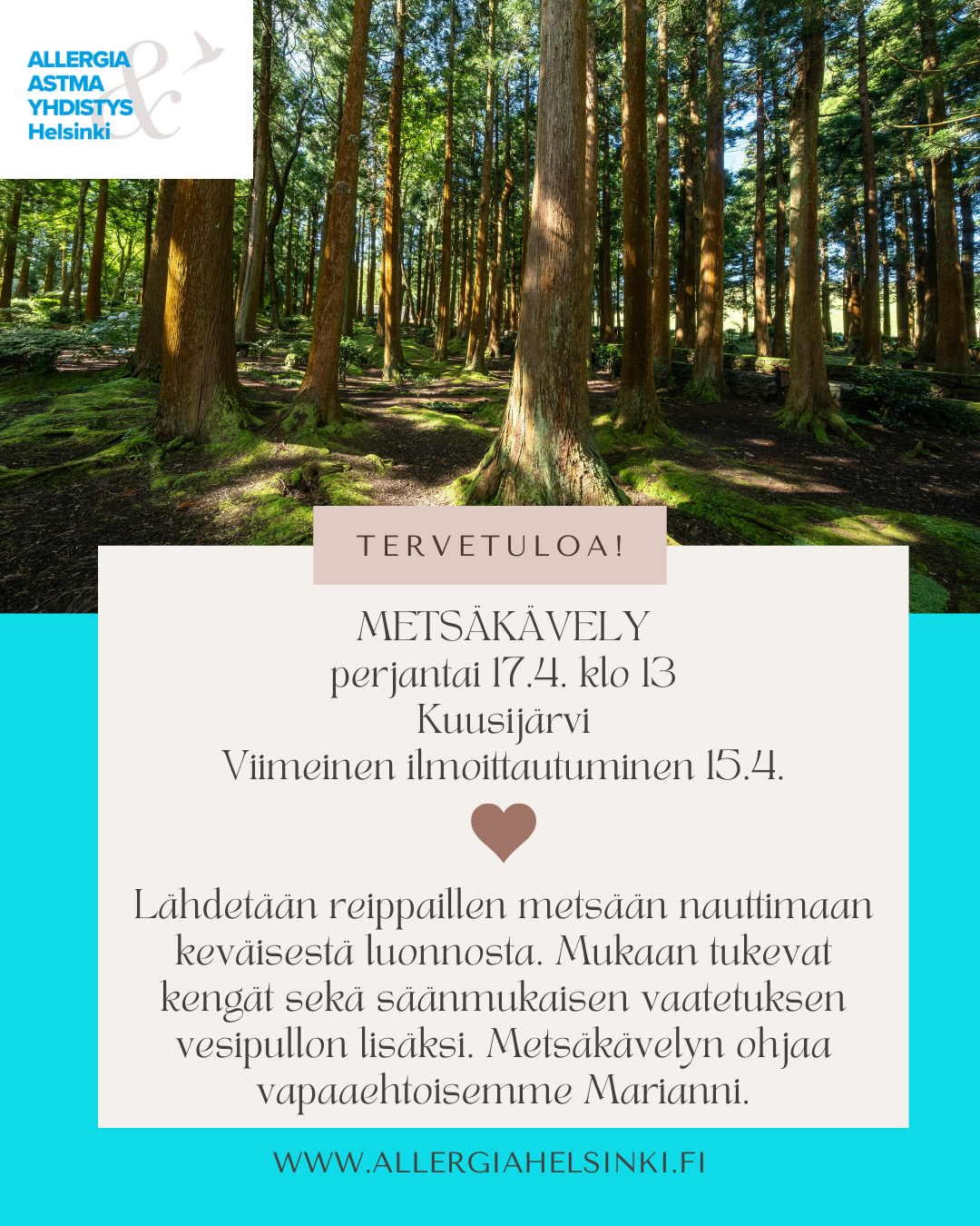 METSÄKÄVELYT-projektin happirikas kevät! Perjantaipäivät 20.3. & 17.4. klo 13 omistetaan pari tuntia jäsenten virkistäytymismahdollisuudelle! Lähdetään reippaillen metsään, kevättalven luontoon…