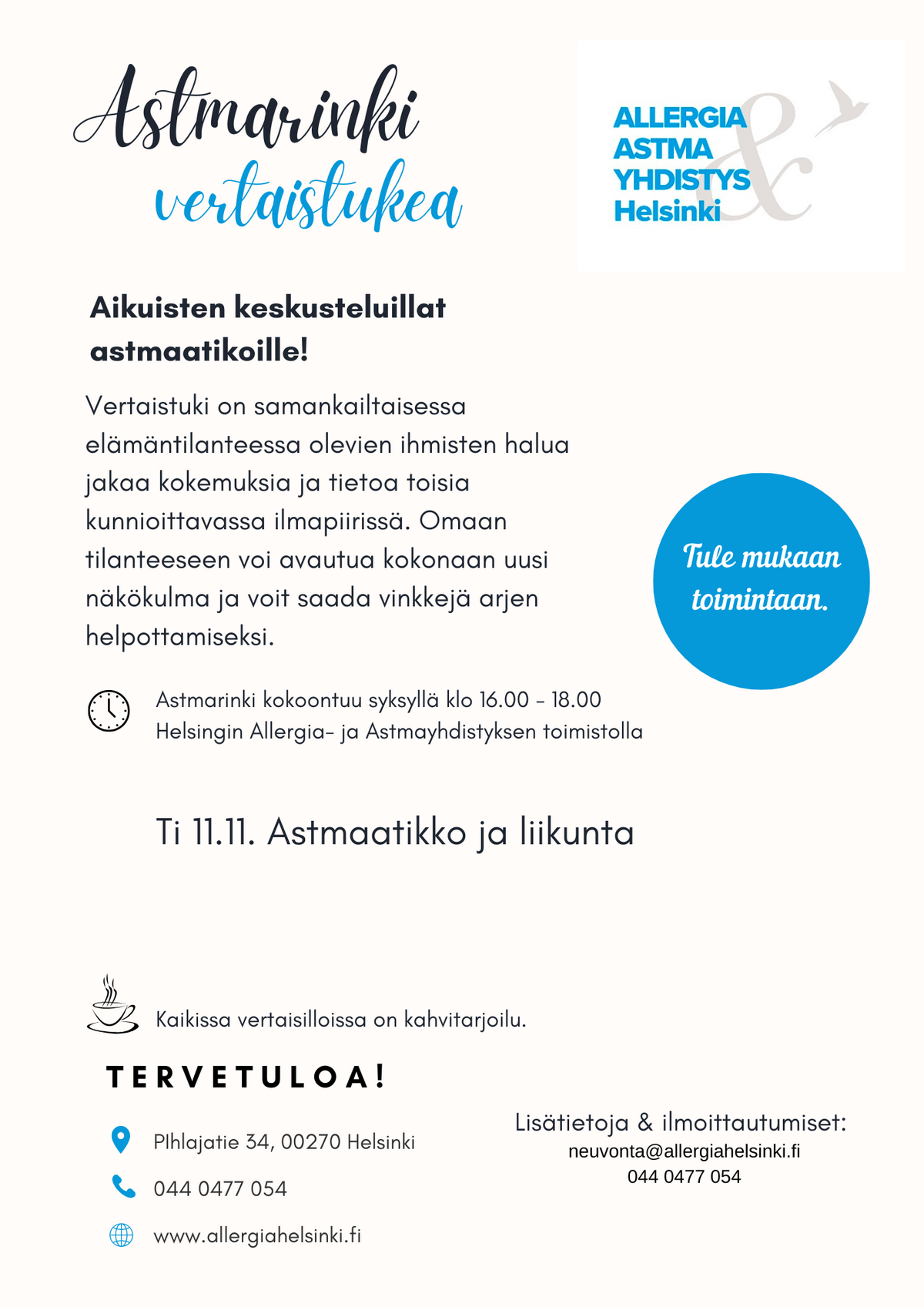 Astmarinki kokoontuu ti 11.11. klo 16.00–18.00 Helsingin Allergia- ja Astmayhdistyksen toimistolla, Pihlajatie 34, 00270 Helsinki.