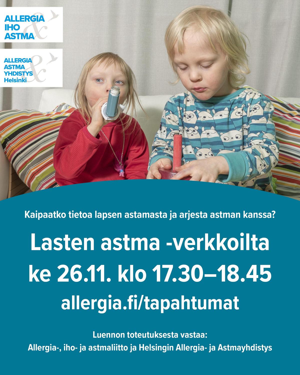 Tule lasten astma -verkkoiltaan. Luennolla pääset kuulemaan lääkäri luennon lasten astmasta ja sen hyvästä hoidosta sekä saat kuulla astmalapsiperheen kokemuksia astman kanssa elämisestä.