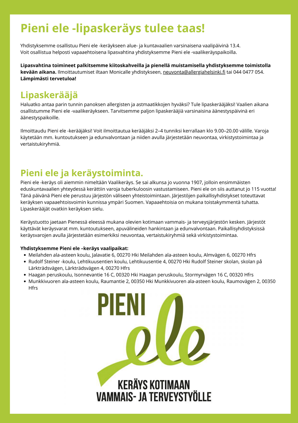 Yhdistyksemme osallistuu Pieni ele -keräykseen alue- ja kuntavaalien varsinaisena vaalipäivinä 13.4.
